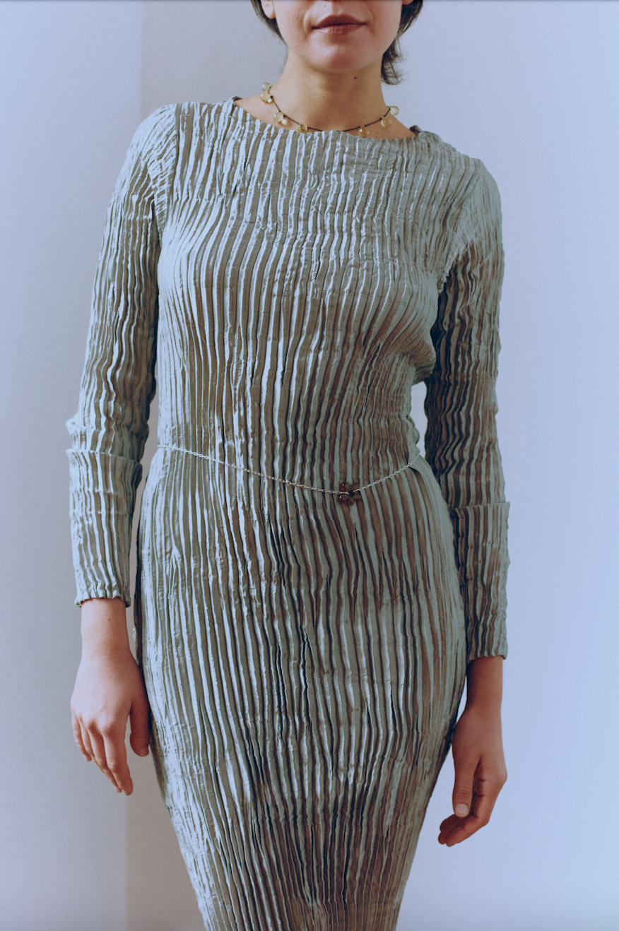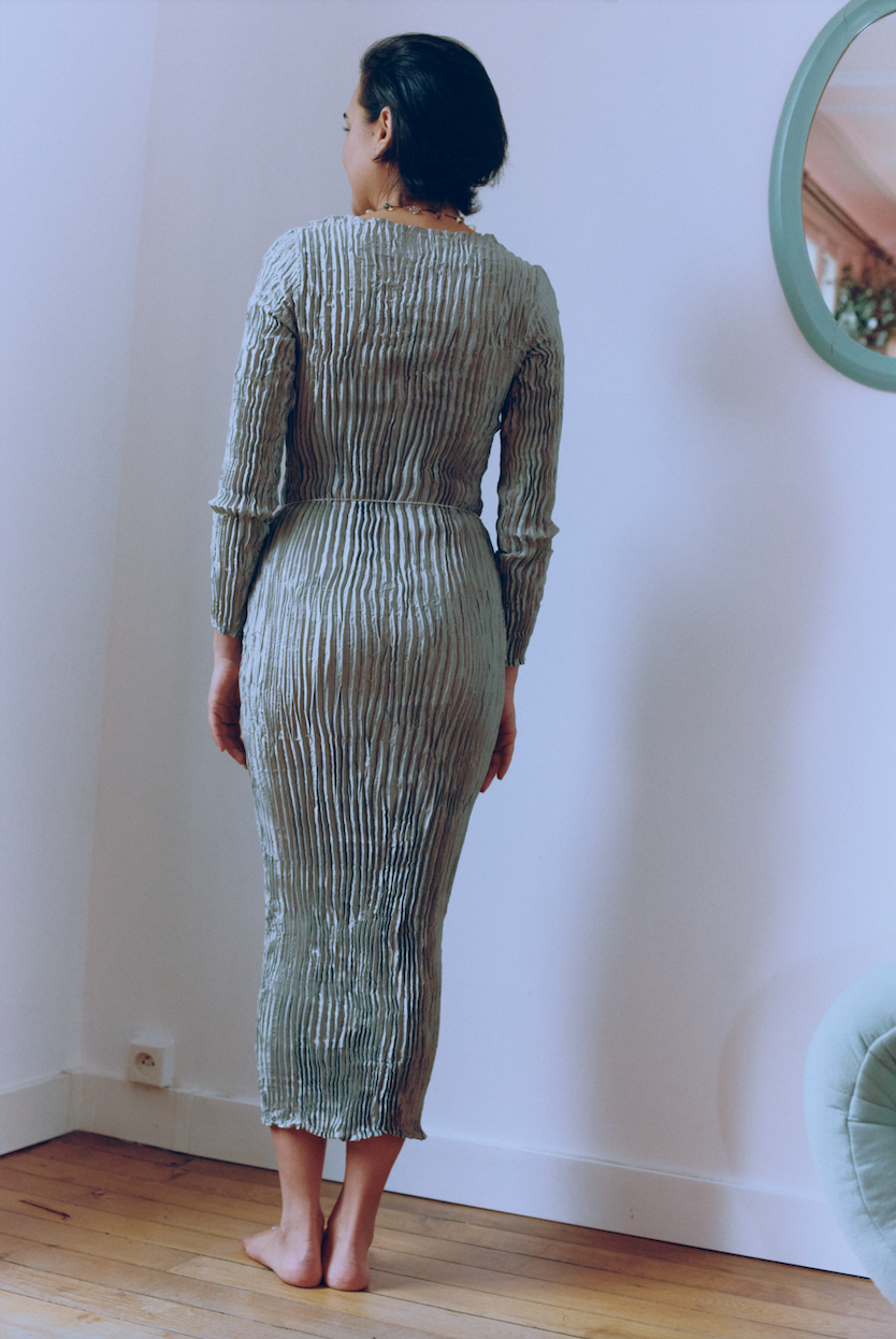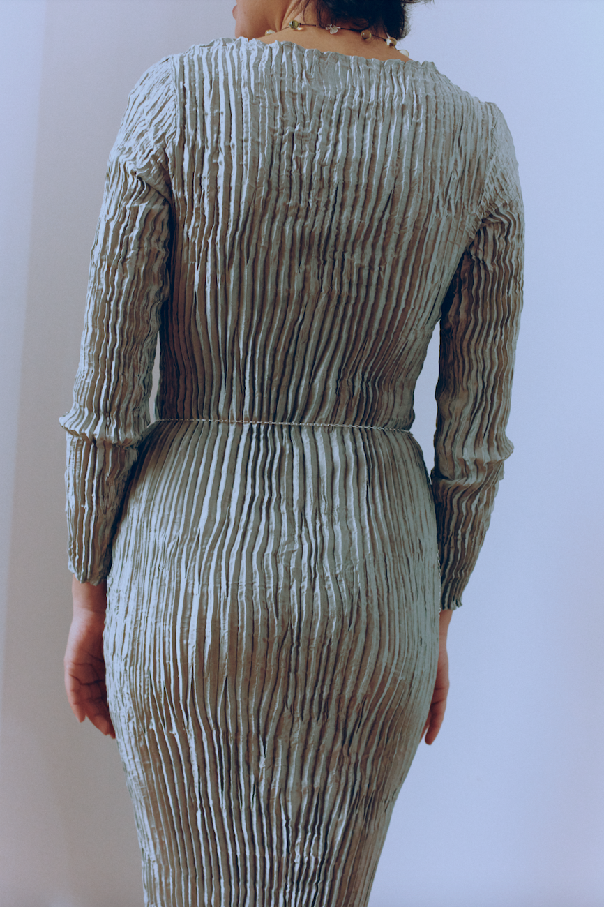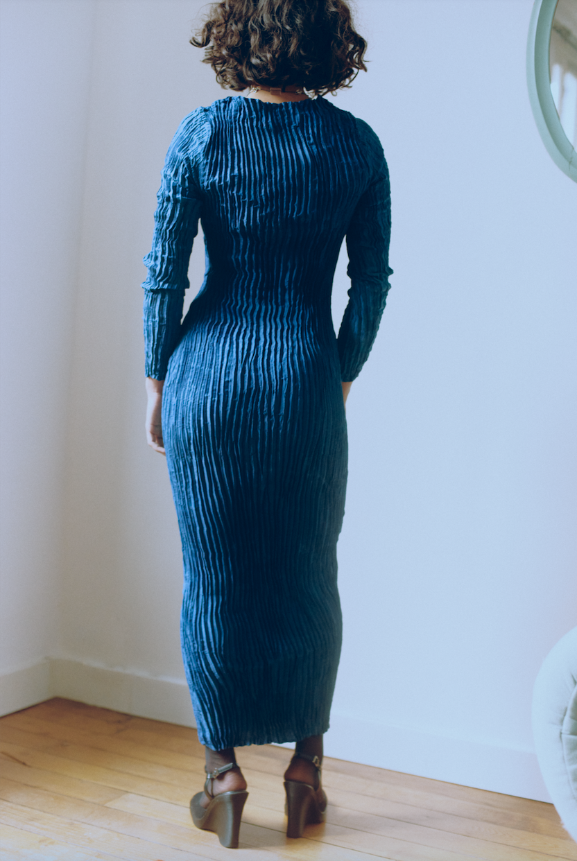 The pleating on silk is not permanent, in order to preserve it we suggest keeping it away from water and recommend professional soft dry clean only. The pleating will flatten with time and wear, in order to maintain it in its best condition, we advise to always store the garment gently rolled-up in its fabric pouch. Botanically dyed colors may fade if left in the sun, in order to preserve them we recommend storing the piece in a dark place. Indigo pieces may bleed in contact with skin or clothing.