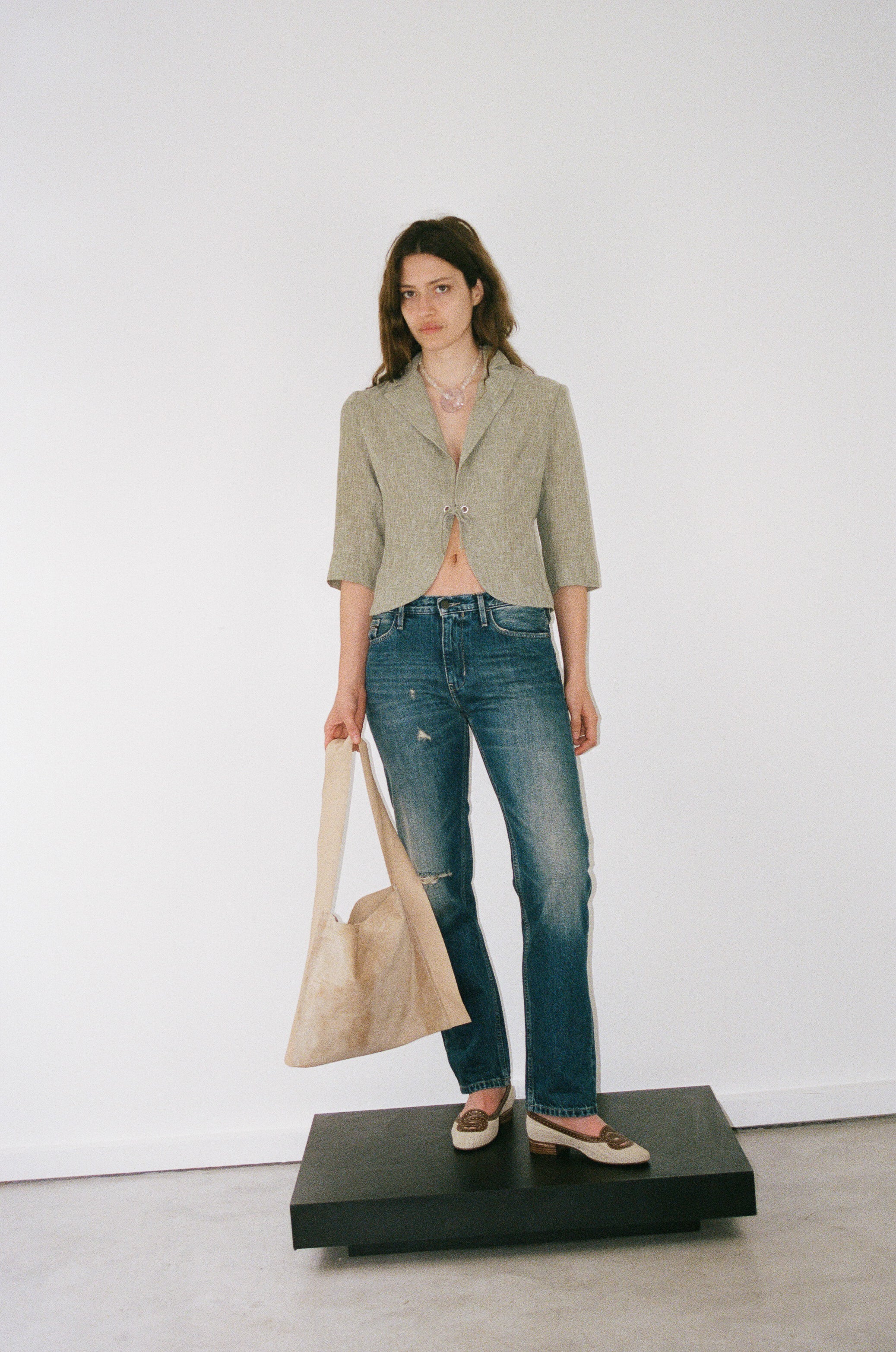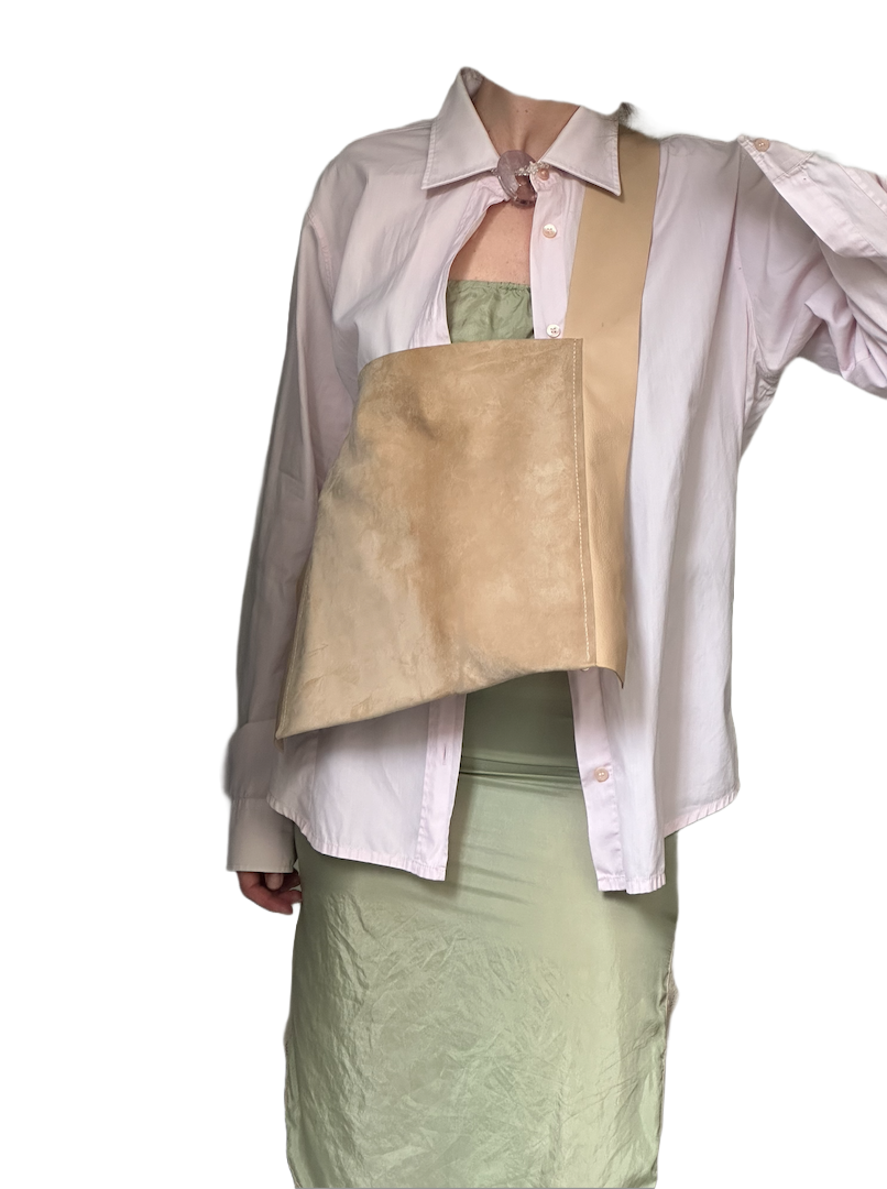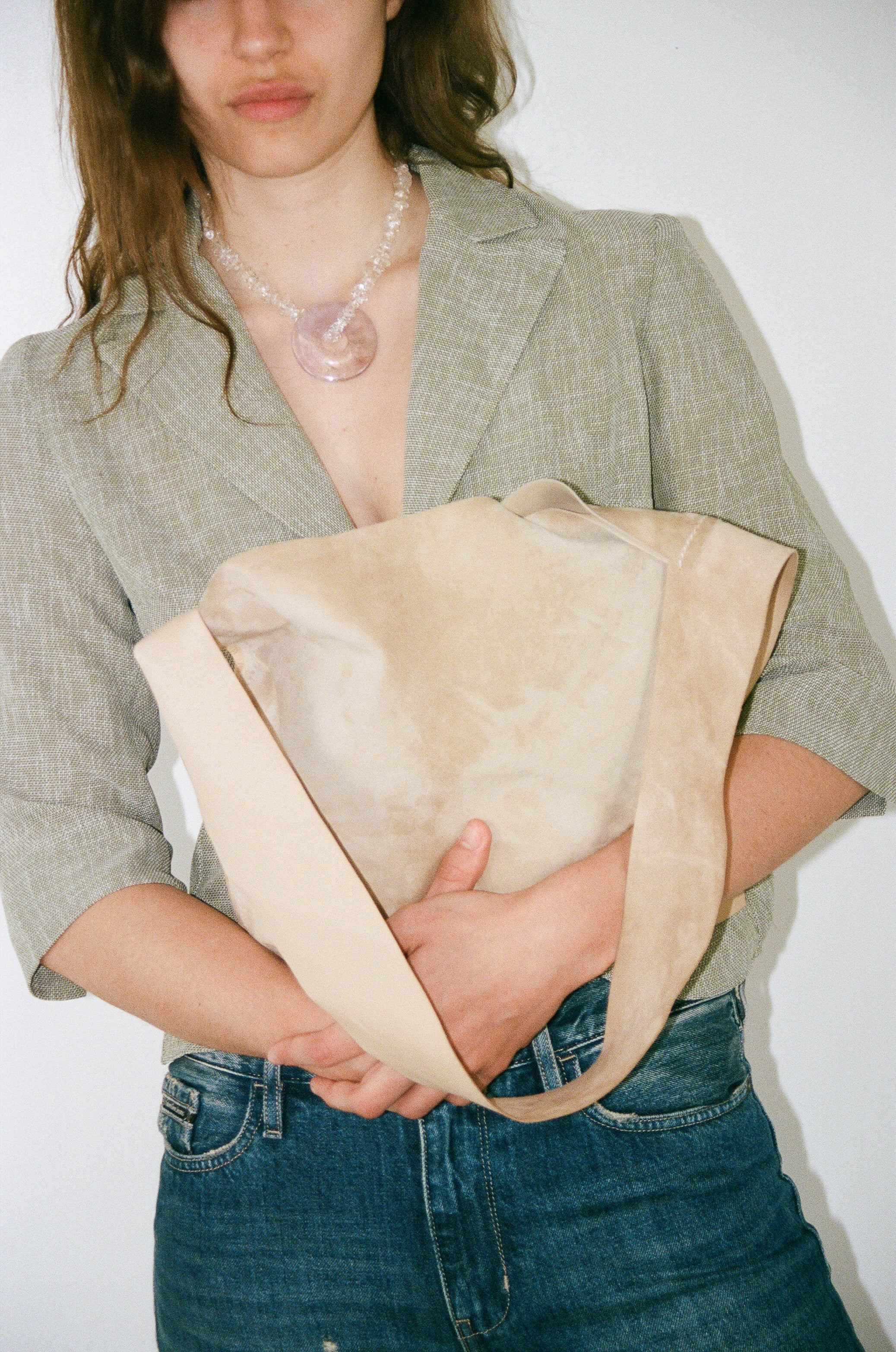 toutbag soft suede version, features a rectangular shape, a single handle in dune sand, crafted from deadstock leather, ultra light but ultra resistant, perfect for laptops, ipads, and everything in between