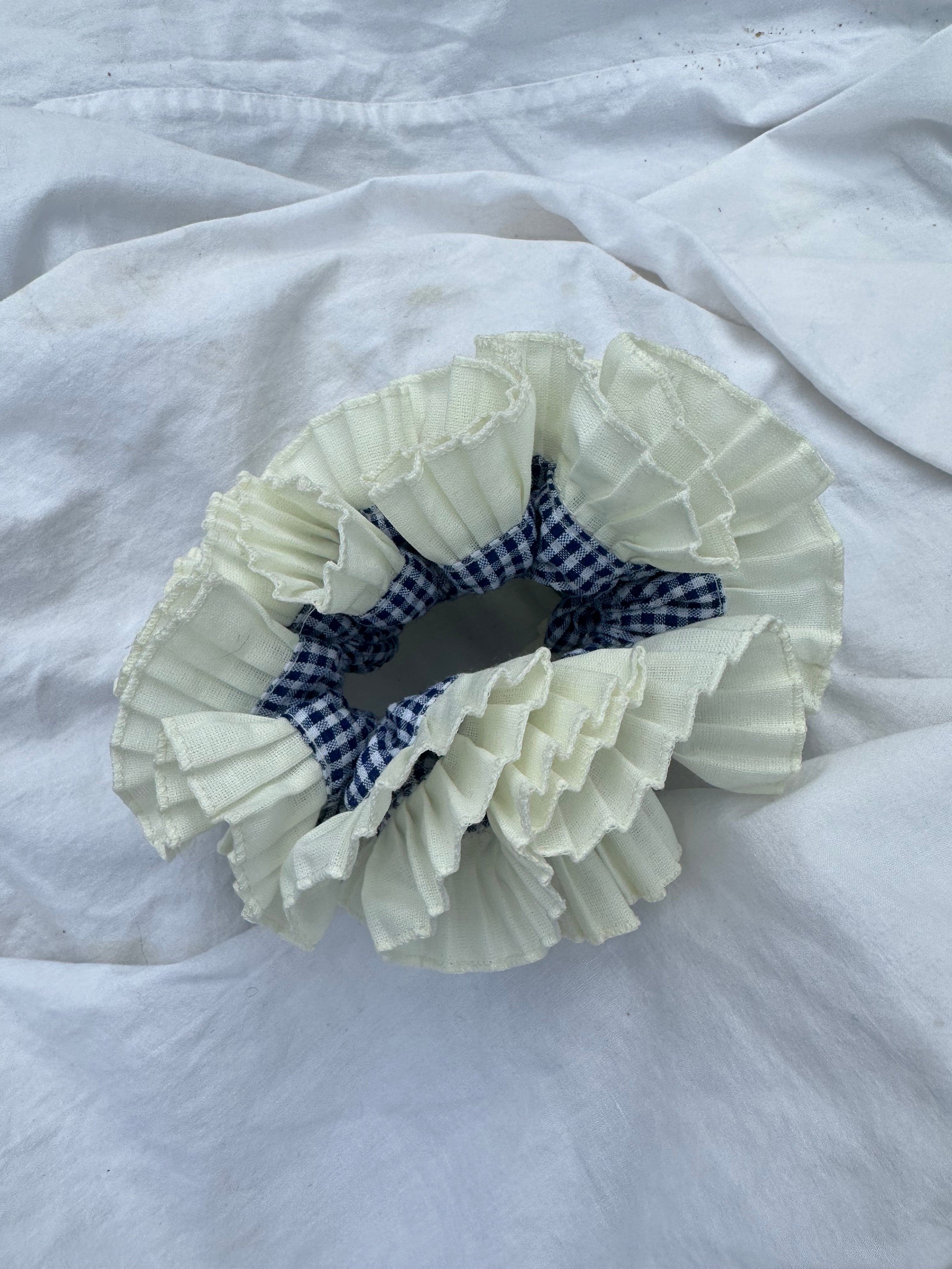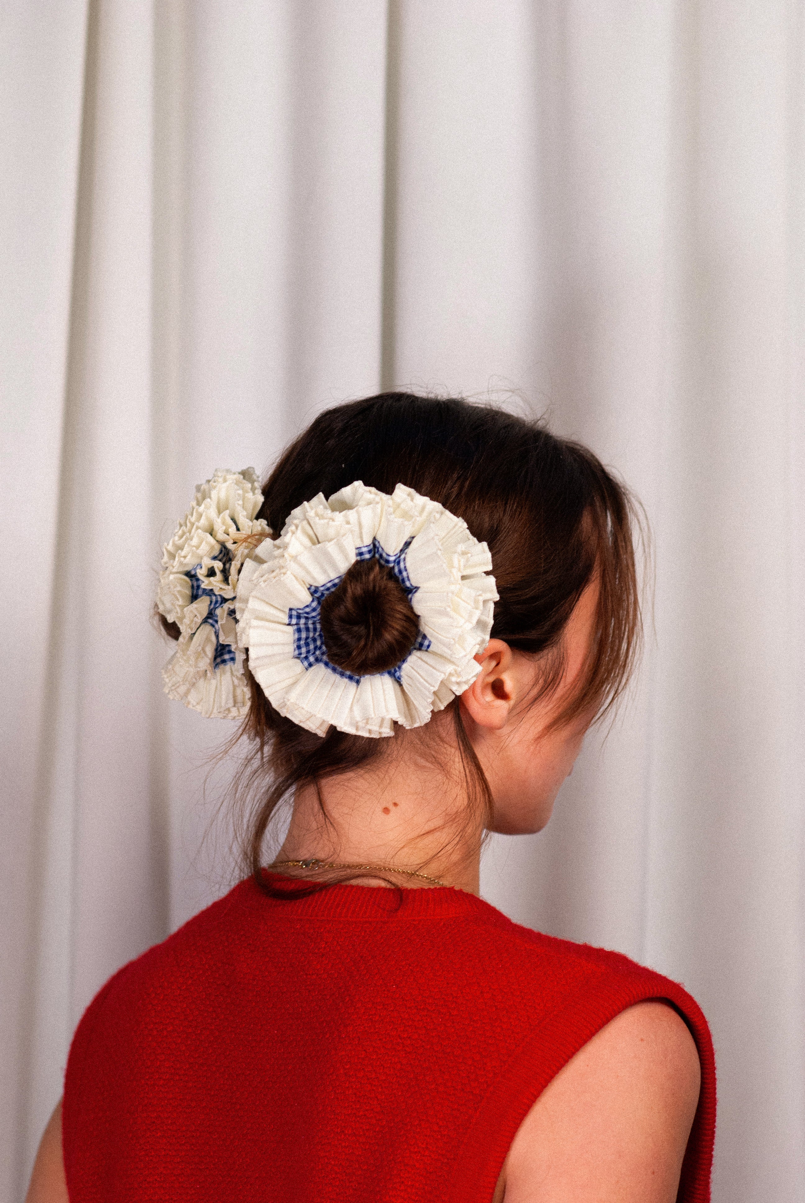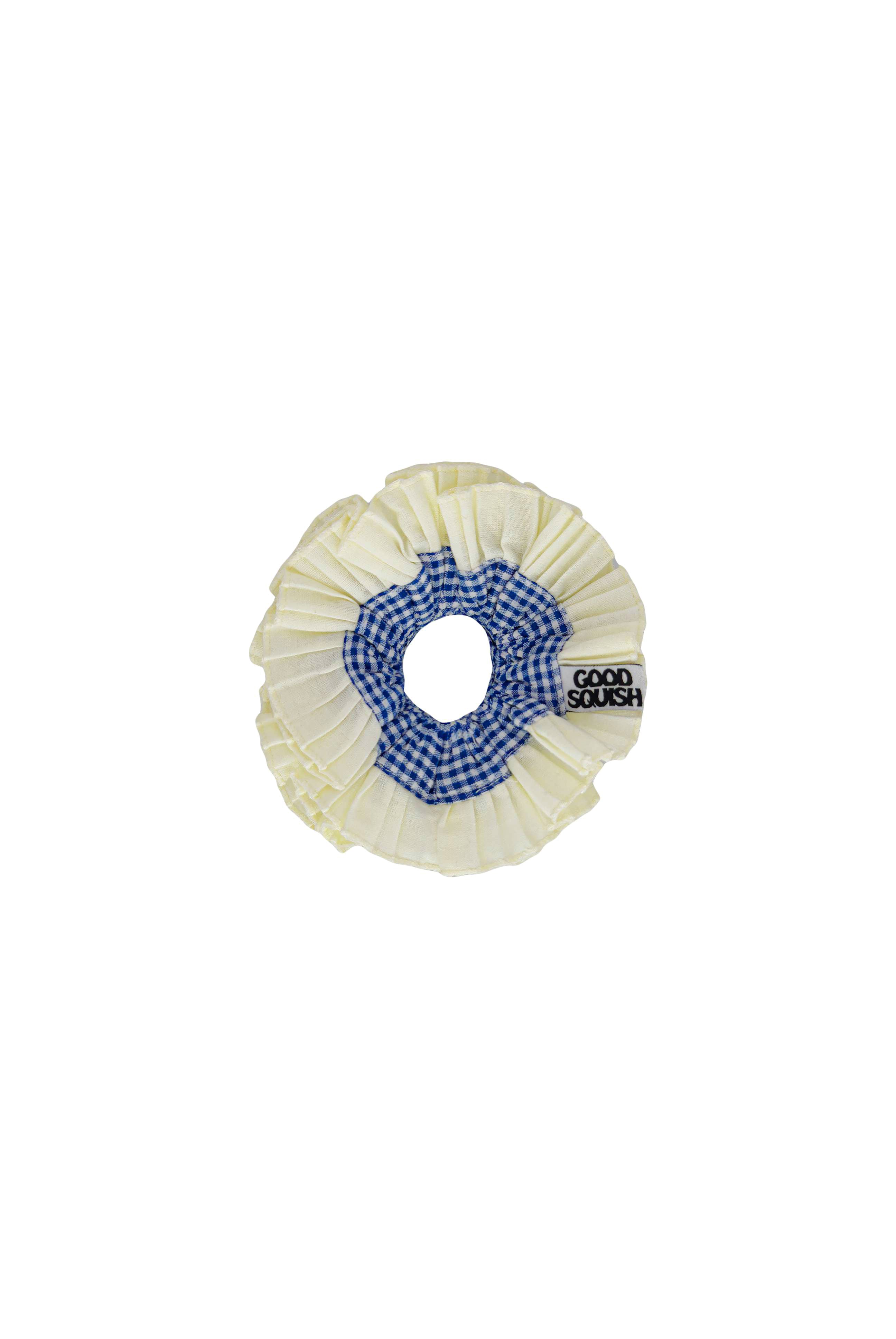 The Good Squish Cowboy is one of the newer additions to the GS family. Made to be worn together but can also be worn apart. Cowboy can be worn looped over once if you have thicker hair and wear it in a bun or doubled over if you have thinner hair or want to wear her in a ponytail ! Blue vichy detail