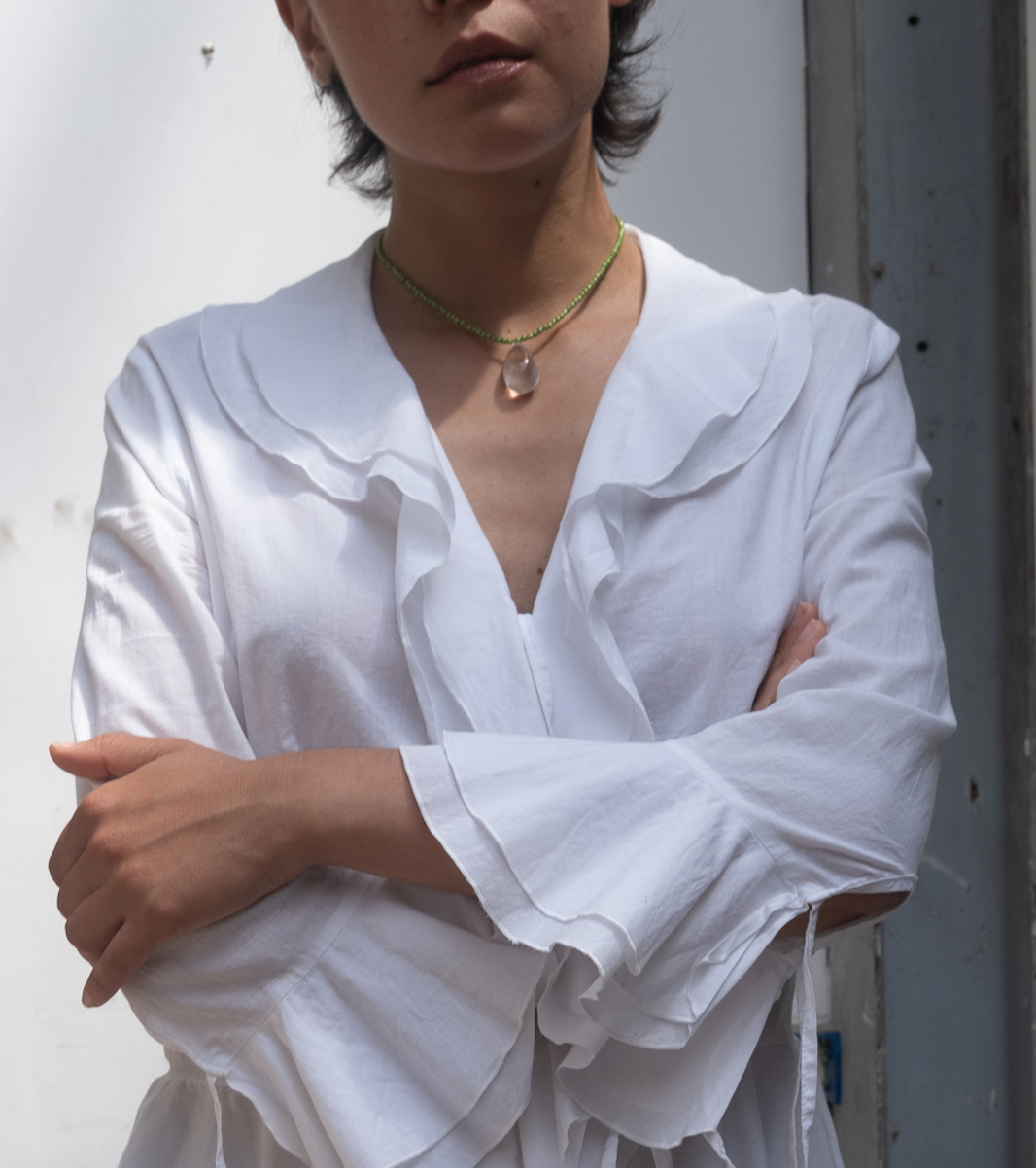 Sisi Joia is based in Paris where Cécile designs her unique collections of jewelries and accessories. Over time, she has gathered beads and pendants from old and traditional deadstock materials. In her atelier she threads together glass, quartz and crystal beads by hand on twisted cords, ruffled bias and elastic wires. Each jewel is made in limited quantity as it depends on the number of beads available. The use of interesting color combinations makes each design very special while wanted to treasure it forever.