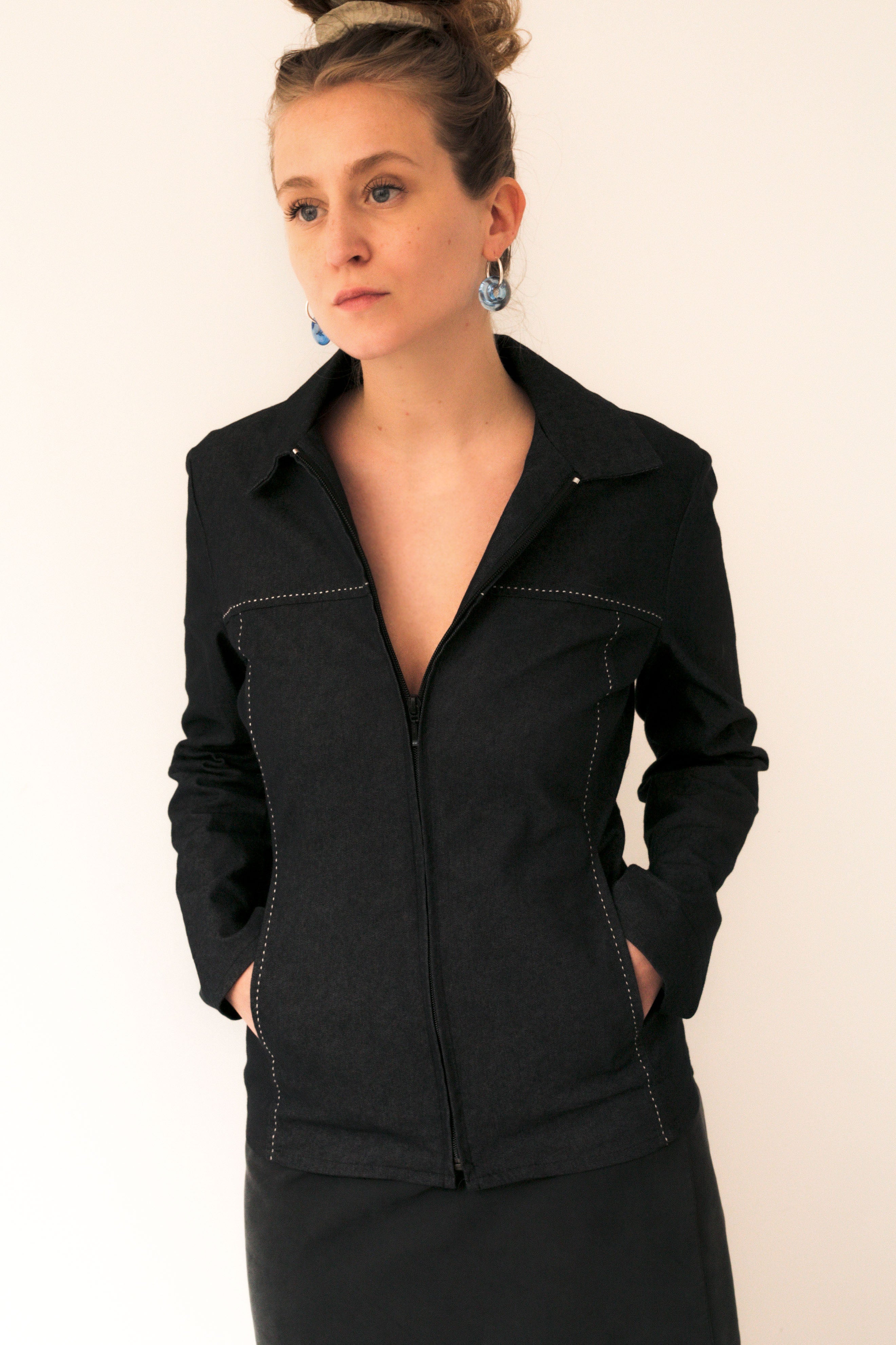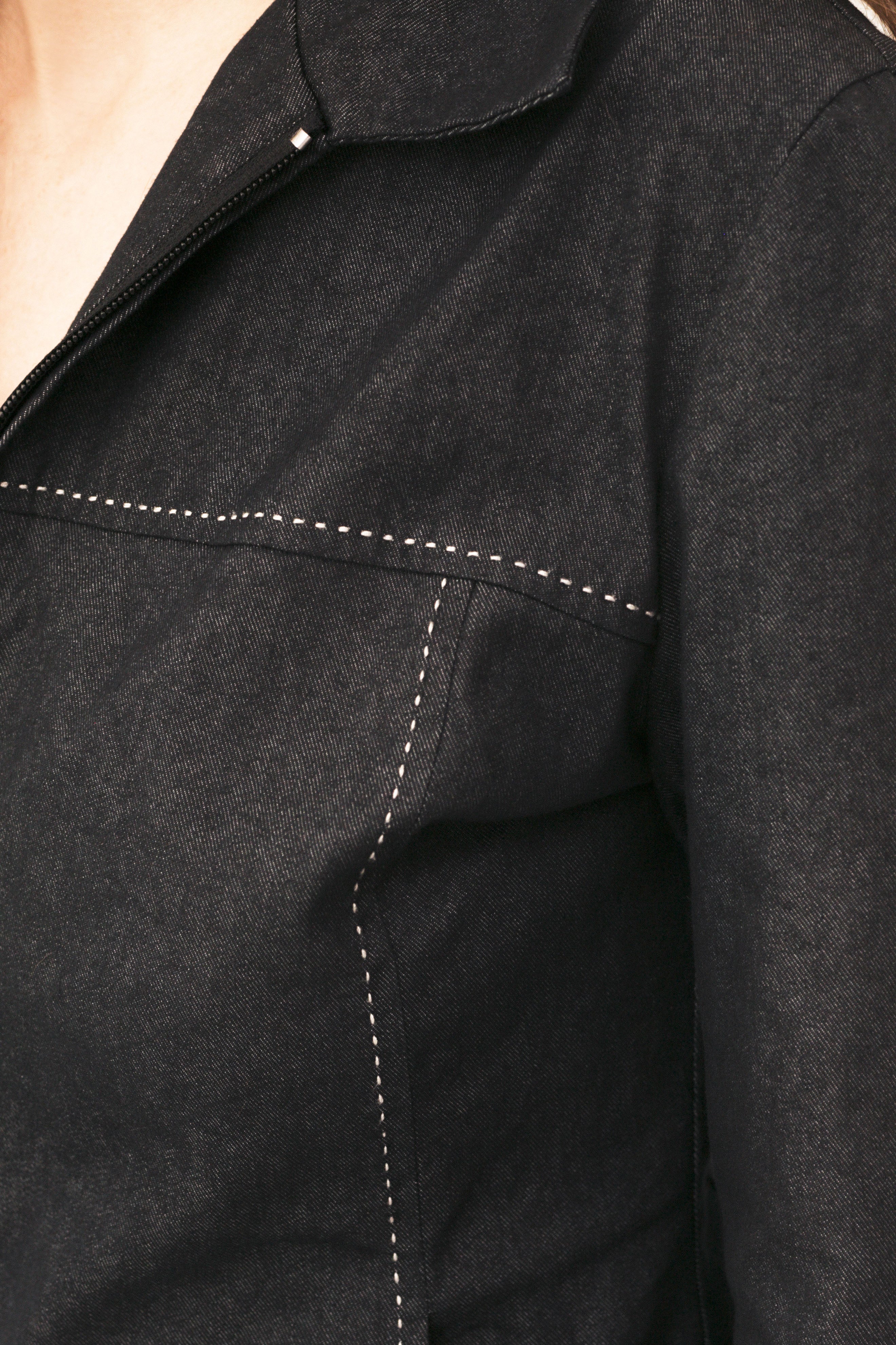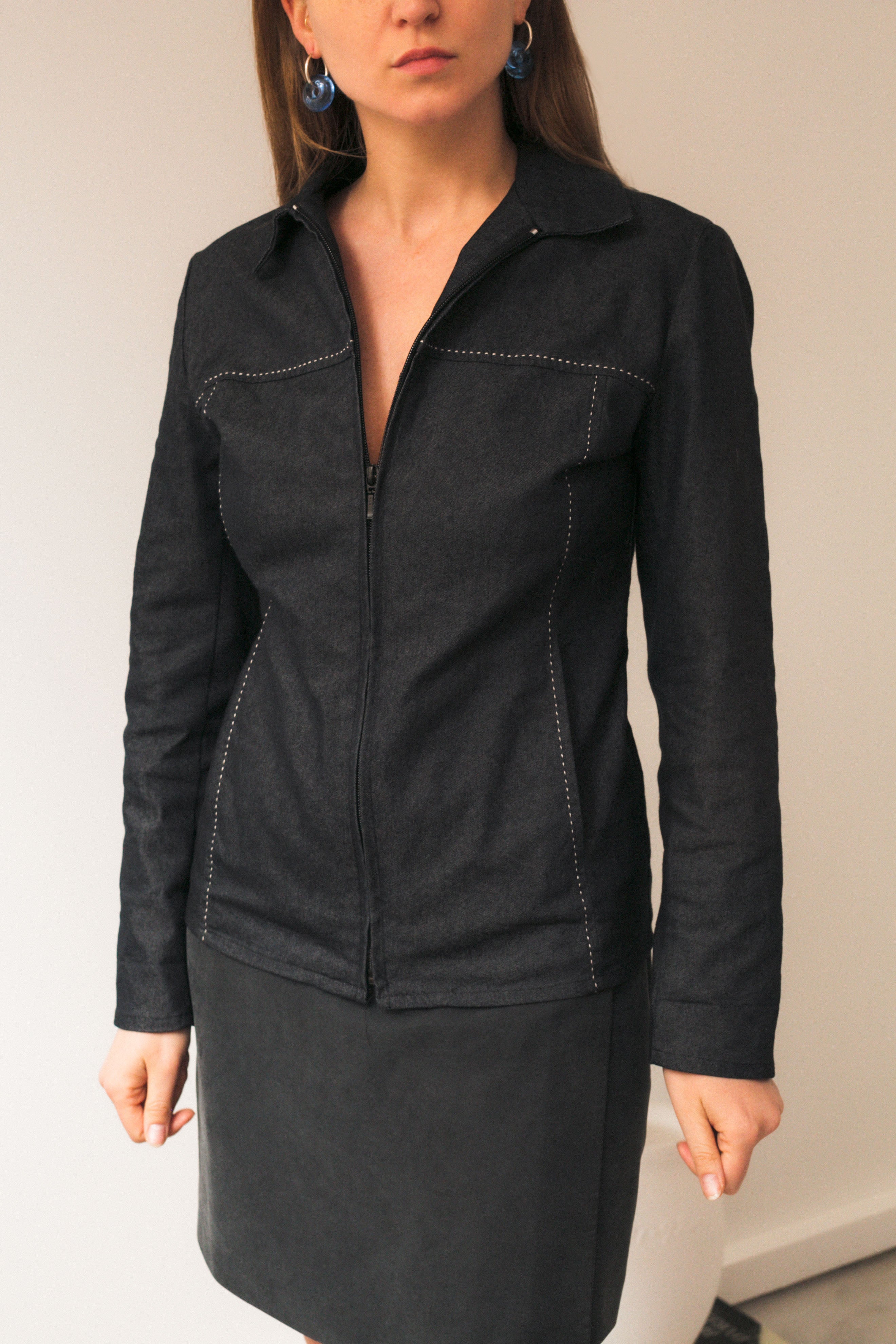 slim-fit denim jacket with white stitching details and yokes front and back, front zip opening . light, soft fabric with slight elasticity, made in France