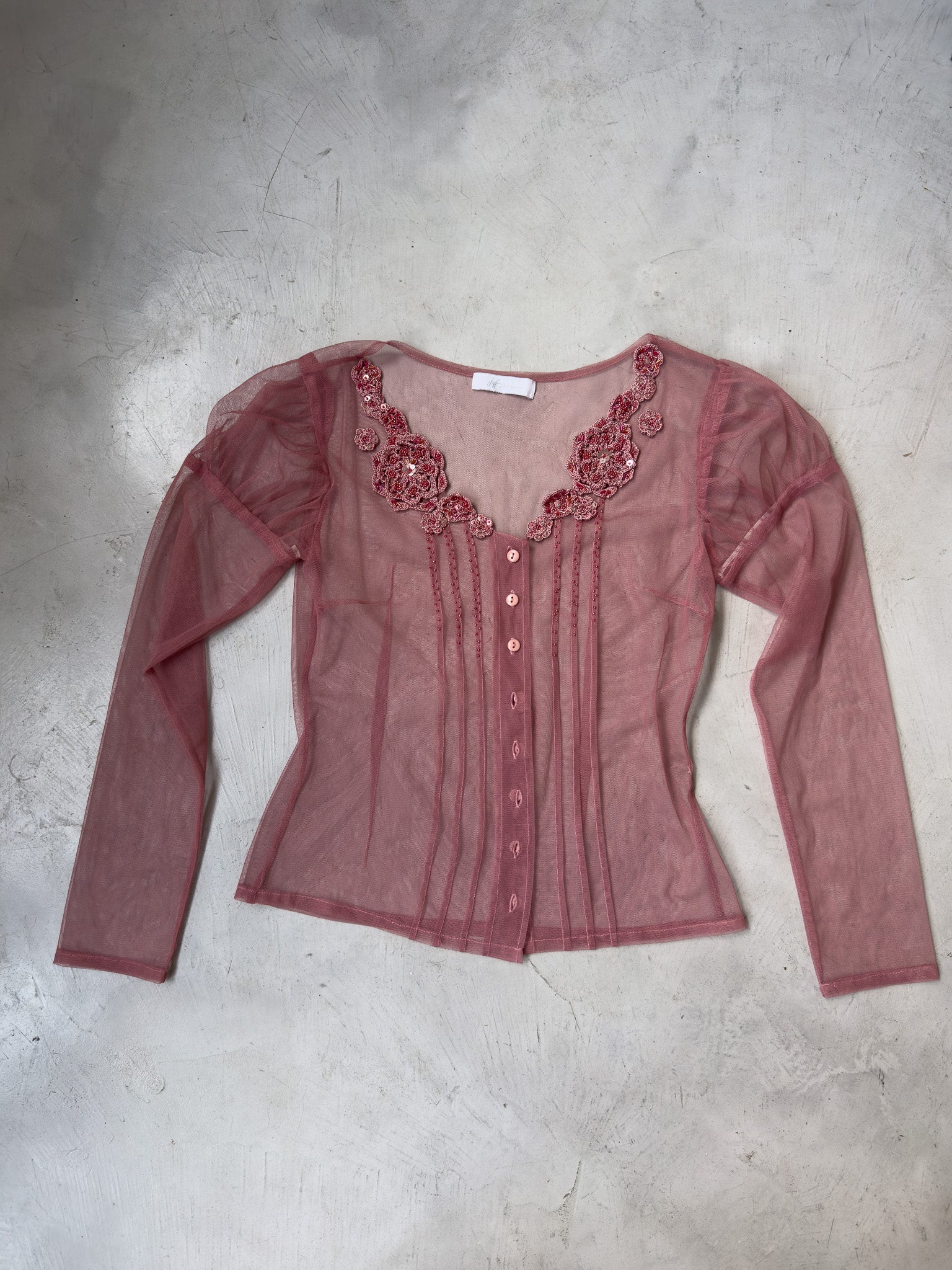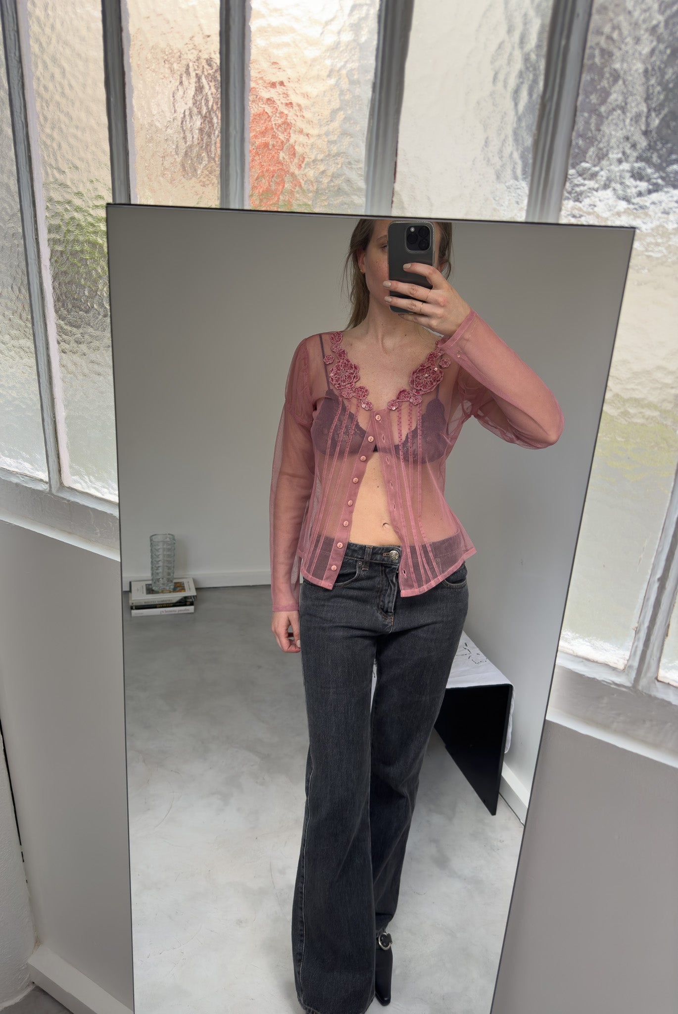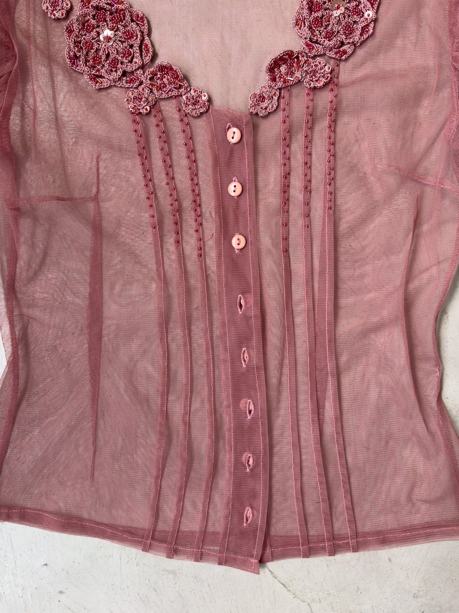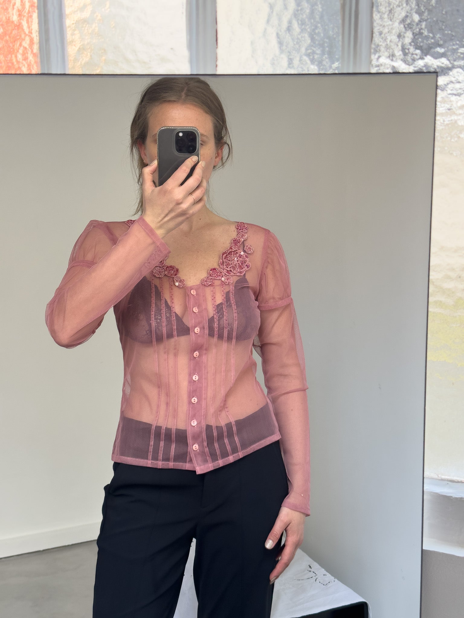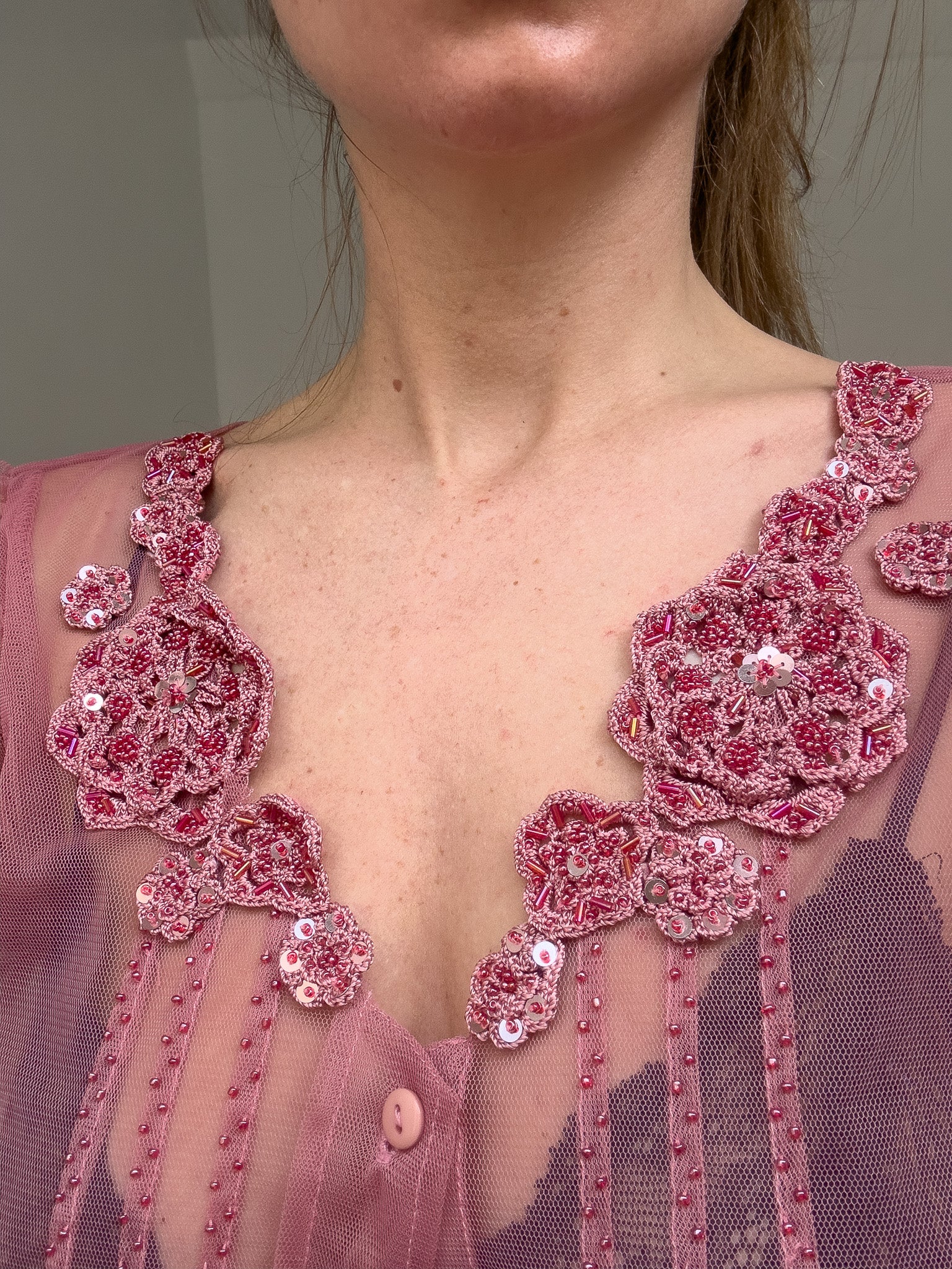 blouse in tulle with pearl embroidery on the neckline, long sleeves with puffed shoulders, fitted at the waist, front button opening