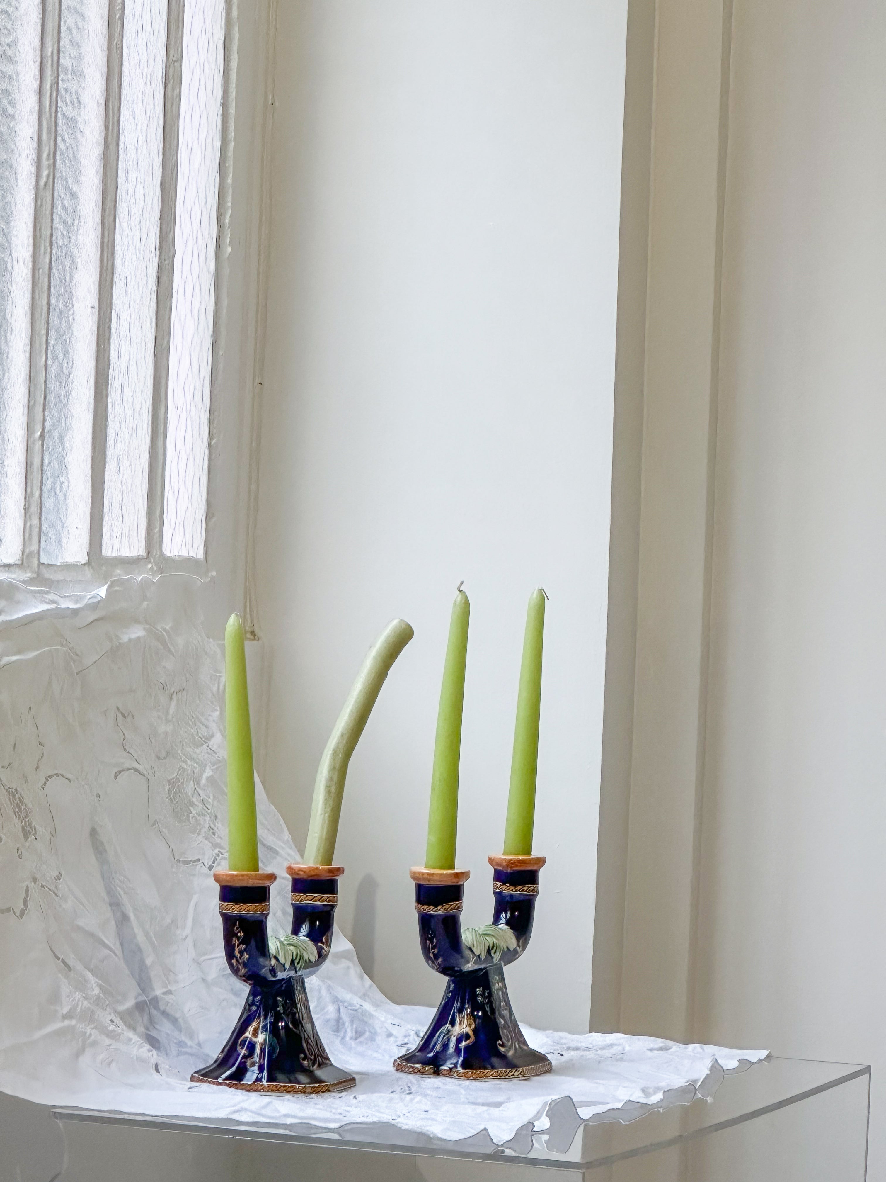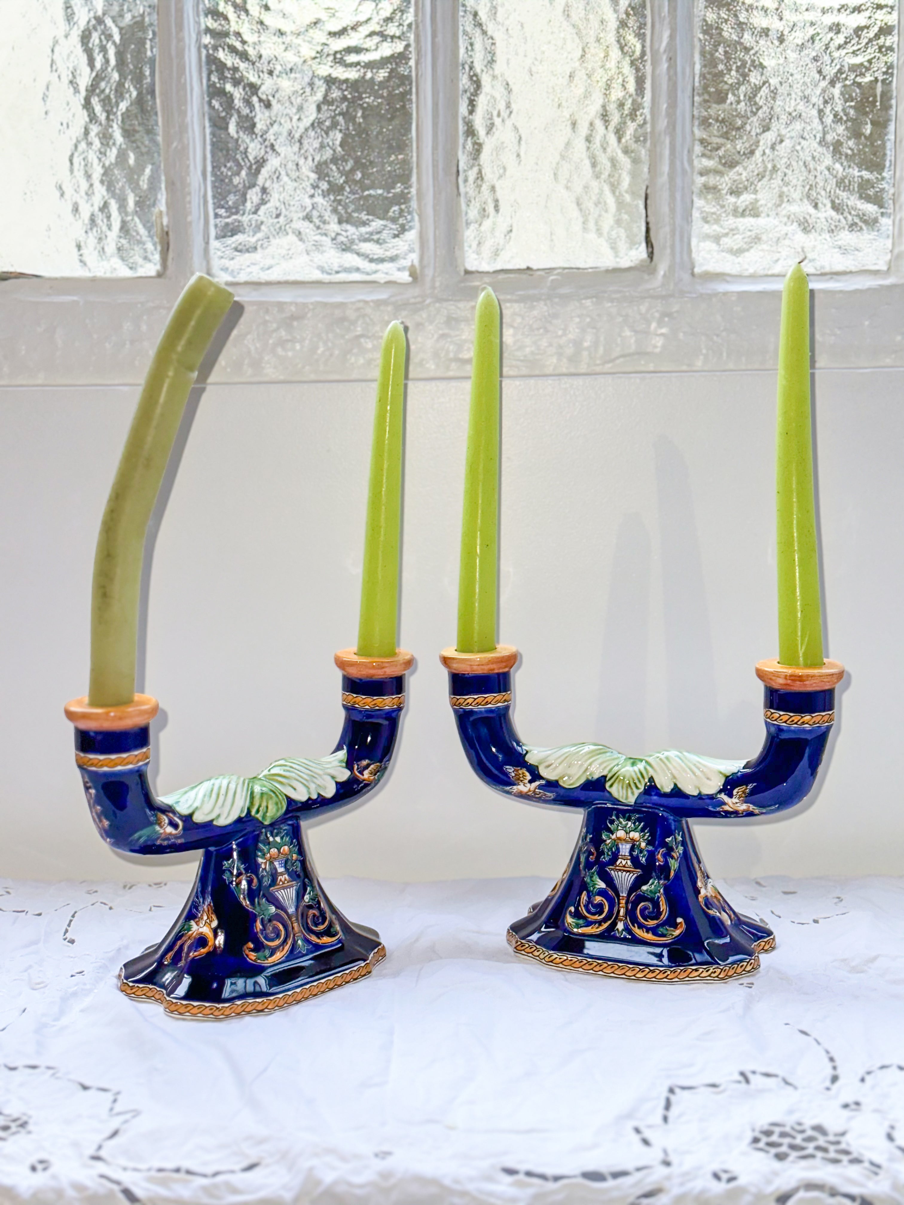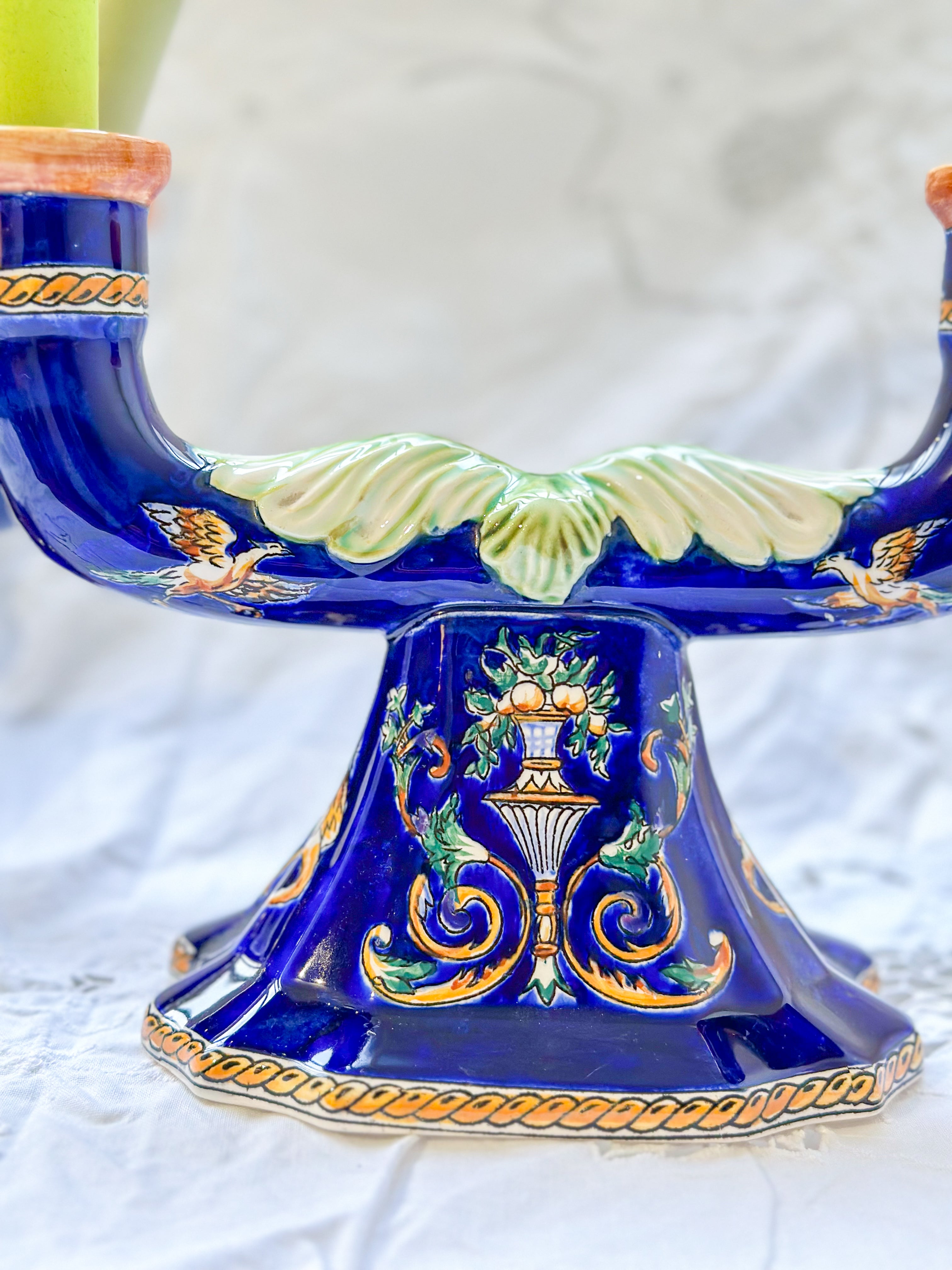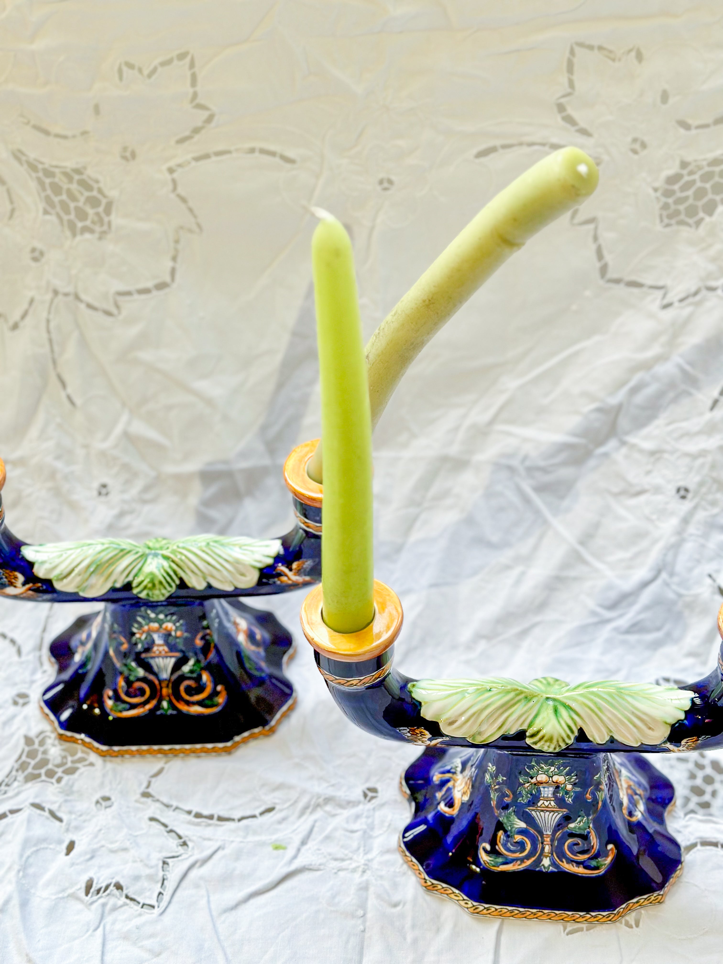 Very nice pair of double candlesticks in earthenware of Gien decorated renaissance on blue background. It is in good condition, no chips. 80s'